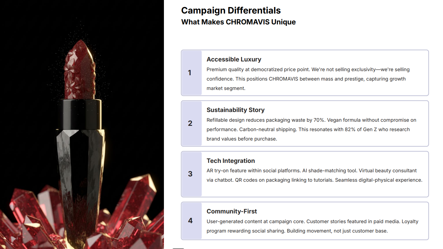 O desafio era passar a essência do produto Batom Ruby com uma estrutura e narrativa dramatica destacando os atributos e sofisticação do produto.