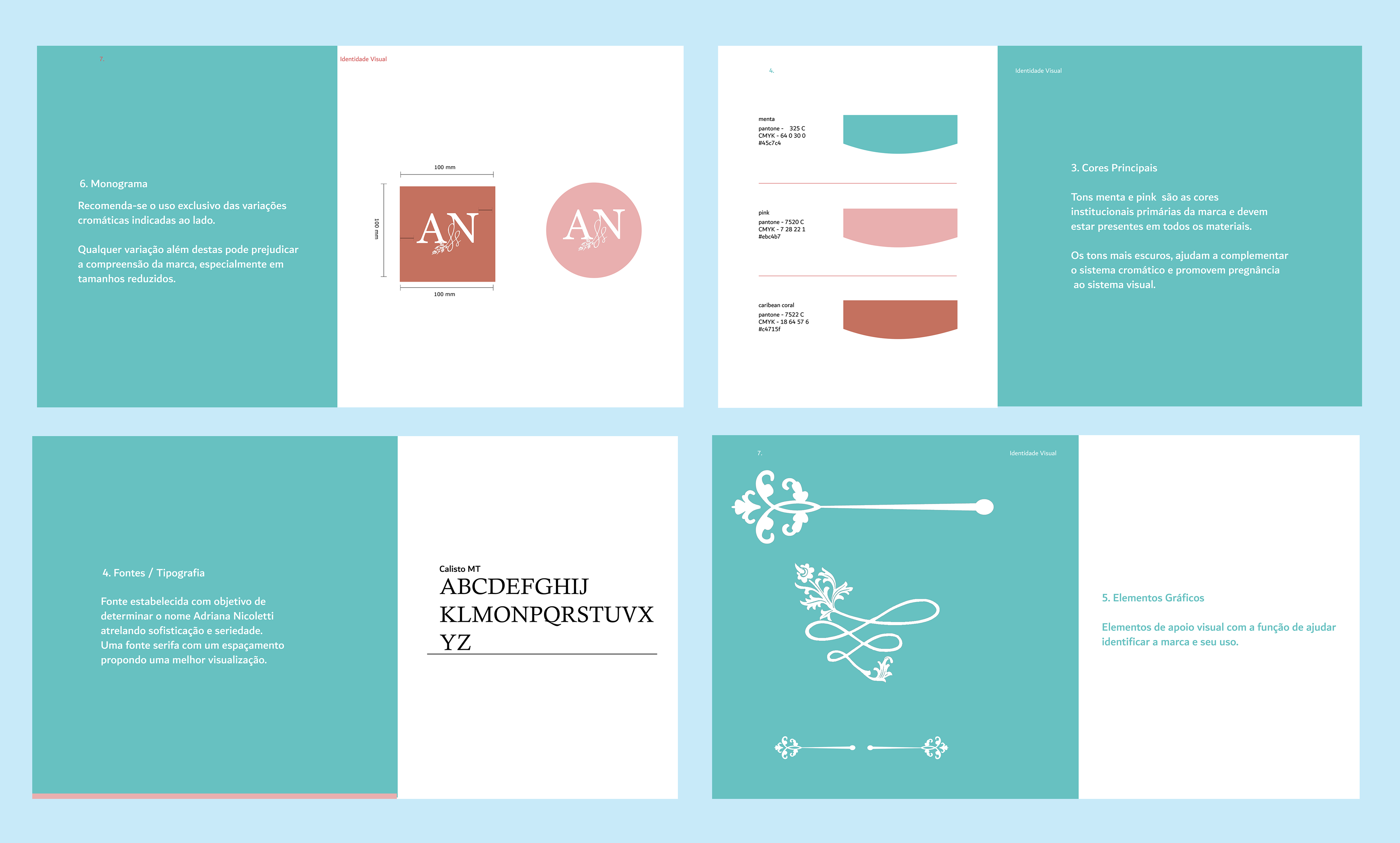 O desafio foi alinhar a sofisticação com um estilo mais clássico, usando cores em tons pasteis secundários e destacando um como mais forte e predominante. Criei um elemento orgânico que ficasse como um Monograma, marcando seu uso em diversas aplicações, por isso sugeri a ampliação de materiais que agregasse valor à marca.